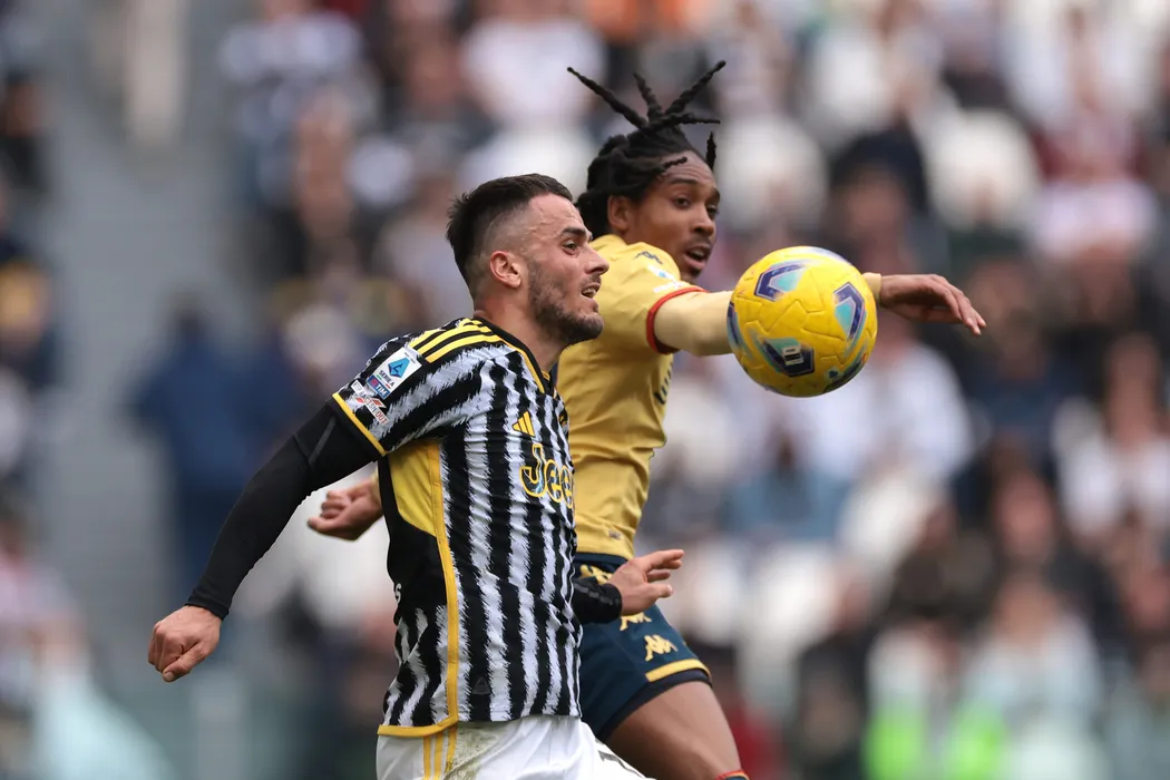 17 March 2024, Italy, Turin: Juventus' Filip Kostic and Genoa's Djed Spence battle for the ball during the Italian Serie A soccer match between Frosinone Juventus and Genoa at the Allianz Stadium. Photo: Jonathan Moscrop/CSM via ZUMA Press Wire/dpa