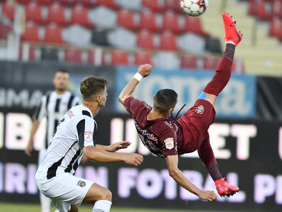 Valentin Costache executa o foarfeca de langa Constantin Dima in meciul de fotbal dintre Astra Giurgiu si CFR Cluj, contand pentru play-off-ul Ligii 1 Casa Pariurilor, disputat fara spectatori pe Stadionul Marin Anastasovici din Giurgiu, duminica 5 iulie 2020. © FOTO:Razvan Pasarica/SPORT PICTURES