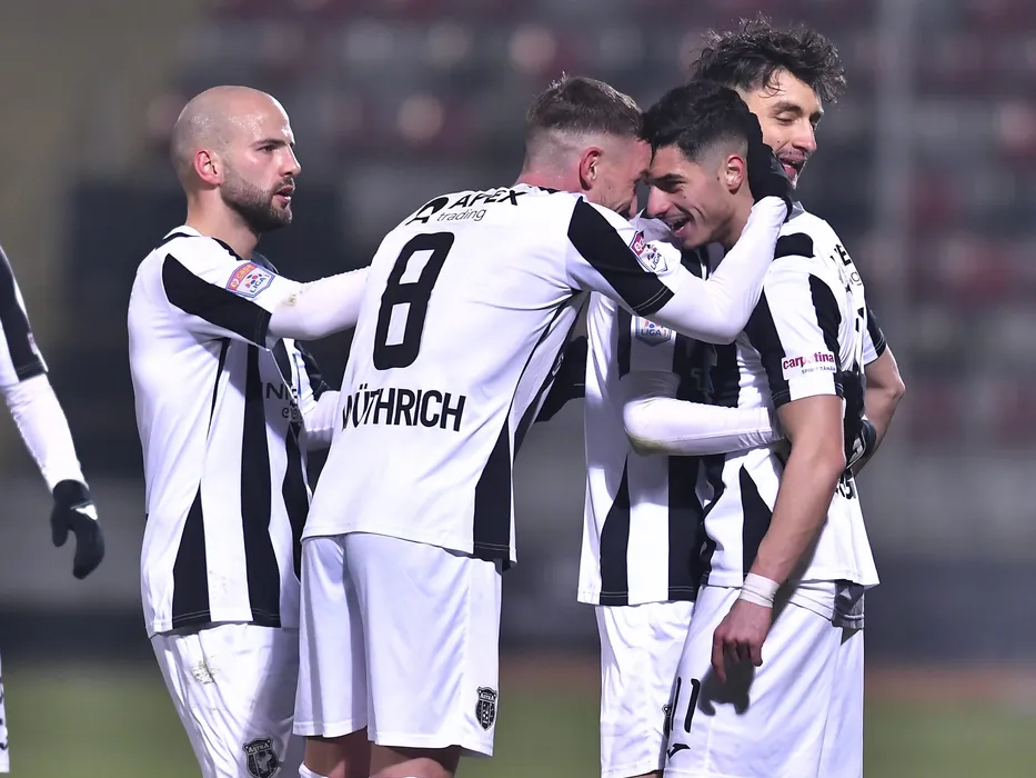 Valentin Gheorghe se bucura dupa un gol marcat alaturi de Dario Canadija, Albert Tivadar Stahl si Sebastien Wuthrich in meciul de fotbal dintre Astra Giurgiu si Dinamo Bucuresti, contand pentru Liga 1 Casa Pariurilor, desfasurat fara spectatori pe Stadionul Marin Anastasovici din Giurgiu, duminica 21 februarie 2021. © FOTO:Razvan Pasarica/SPORT PICTURES