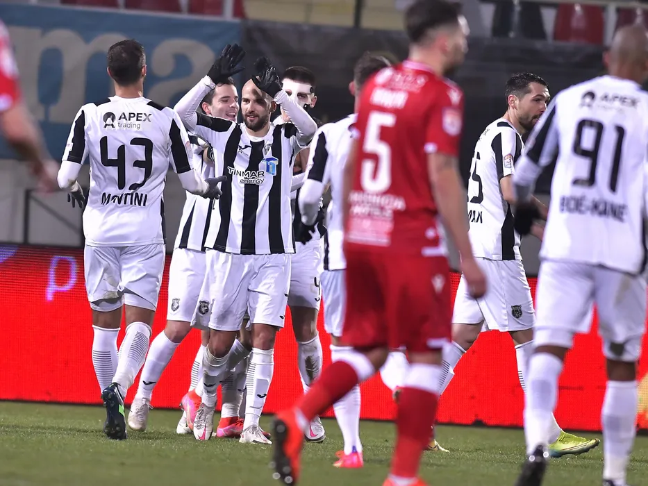 Bucurie a fotbalistilor de la Astra dupa un gol marcat cu Dario Canadija, David Bruno Carneiro, Daniel Graovac si Valerica Marius Gaman in meciul de fotbal dintre Astra Giurgiu si Dinamo Bucuresti, contand pentru Liga 1 Casa Pariurilor, desfasurat fara spectatori pe Stadionul Marin Anastasovici din Giurgiu, duminica 21 februarie 2021. © FOTO:Razvan Pasarica/SPORT PICTURES