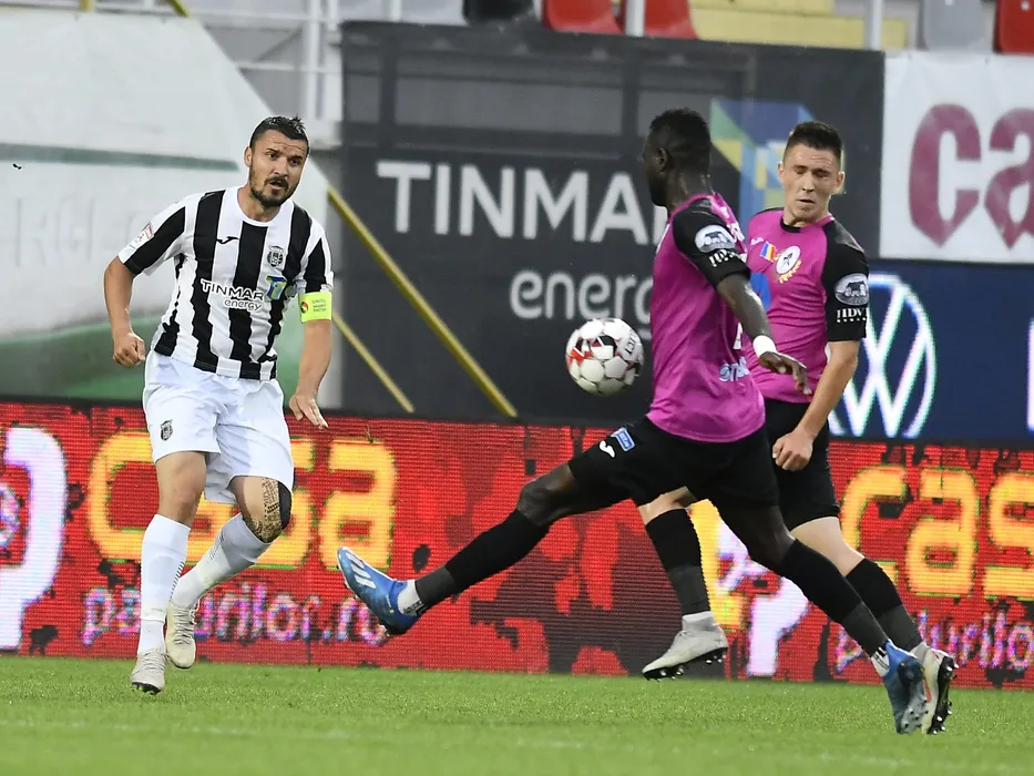 Constantin Budescu si Mihai Velisar in meciul de fotbal dintre Astra Giurgiu si Gaz Metan Medias, contand pentru play-off-ul Ligii 1 Casa Pariurilor, disputat fara spectatori pe Stadionul Marin Anastasovici din Giurgiu, luni 15 iunie 2020. © FOTO:Razvan Pasarica/SPORT PICTURES