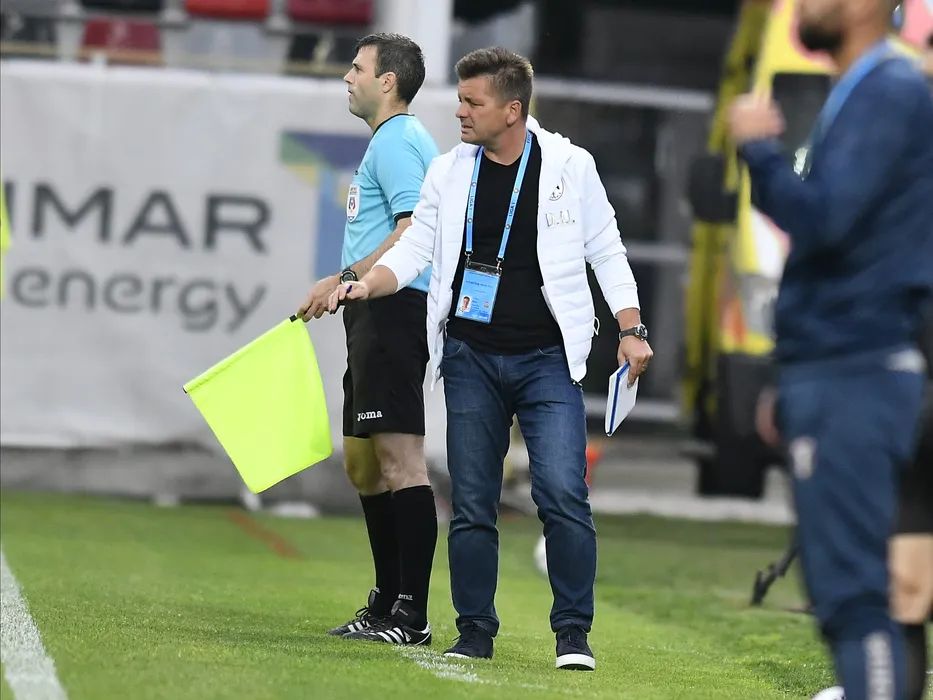 Arbitrul asistent Marius Badea alaturi de Dusan Uhrin in meciul de fotbal dintre Astra Giurgiu si Gaz Metan Medias, contand pentru play-off-ul Ligii 1 Casa Pariurilor, disputat fara spectatori pe Stadionul Marin Anastasovici din Giurgiu, luni 15 iunie 2020. © FOTO:Razvan Pasarica/SPORT PICTURES