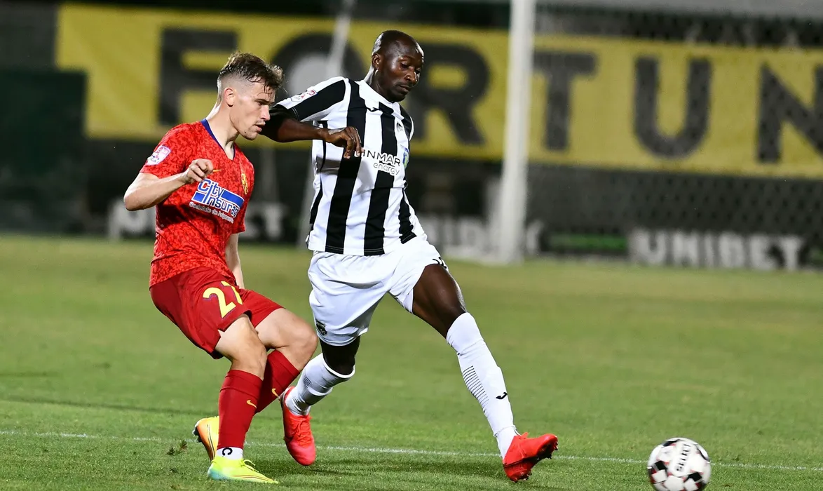Darius Olaru si Kehinde Fatai in meciul de fotbal dintre Astra Giurgiu si FCSB, contand pentru play-off-ul Ligii 1 Casa Pariurilor, disputat fara spectatori pe Stadionul Marin Anastasovici din Giurgiu, luni 29 iunie 2020. © FOTO:Razvan Pasarica/SPORT PICTURES