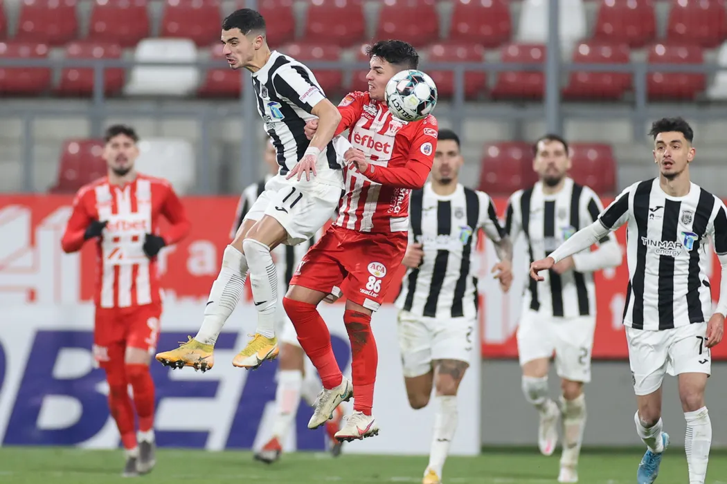Denis Rusu (D), de la UTA Arad, si Valentin Gheorghe (S), de la Astra Giurgiu, lupta pentru posesia balonului in meciul de fotbal dintre UTA ARAD si AFC Astra Giurgiu din etapa a XV-a a Ligii 1, disputat pe Arena Francisc Neuman din Arad, luni, 21 decembrie 2020. SEBASTIAN TATARU / MEDIAFAX FOTO