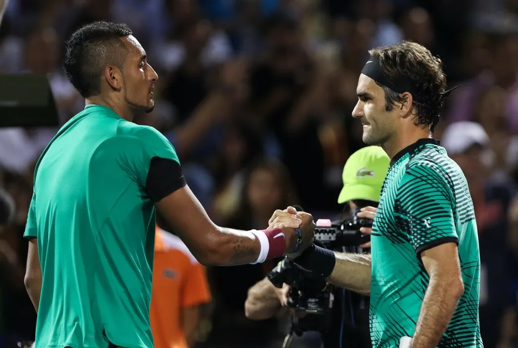March 31, 2017: Roger Federer, right, of Switzerland, shakes hands with Nick Kyrgios, left, of Australia, after his victory in three sets of a men's semifinal match at the 2017 Miami Open presented by Itau professional tennis tournament, played at Crandon Park Tennis Center in Key Biscayne, Florida, USA. Mario Houben/CSM,Image: 700615616, License: Rights-managed, Restrictions: This content is intended for editorial use only. For other uses, additional clearances may be required.