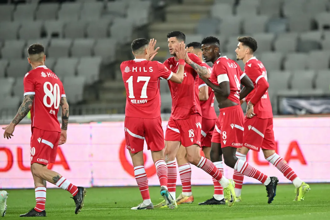 Fotbalistii dinamovisti se bucura dupa un gol marcat in meciul de fotbal dintre FC Universitatea Cluj si Dinamo Bucuresti, contand pentru Superliga Superbet - Play-Off, desfasurat pe Stadionul Cluj Arena din Cluj-Napoca, sambata 12 aprilie 2025. © FOTO: Flaviu Buboi/SPORT PICTURES