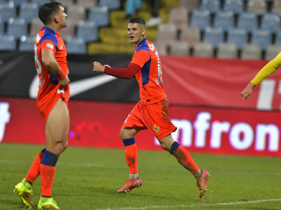 Ioan Andrei Vasile Dumiter se bucura dupa un gol marcat in meciul de fotbal dintre FCSB si CS Mioveni, contand pentru Liga 1 Casa Pariurilor, desfasurat pe Stadionul Gloria din Buzau, sambata 16 octombrie 2021. © FOTO:Razvan Pasarica/SPORT PICTURES