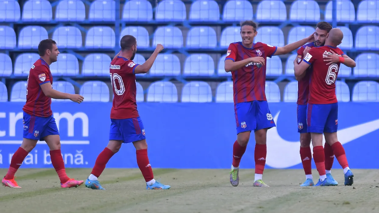 Tsvetelin Chunchukov se bucura dupa un gol marcat alaturi de adrian Popa, Laurentiu Corbu si Atanas Trica in meciul amical de fotbal dintre Farul Constanta si Steaua Bucuresti, desfasurat pe Stadionul central al Academiei Gheorghe Hagi din Ovidiu, vineri 8 iunie 2022. © FOTO:Razvan Pasarica/SPORT PICTURES