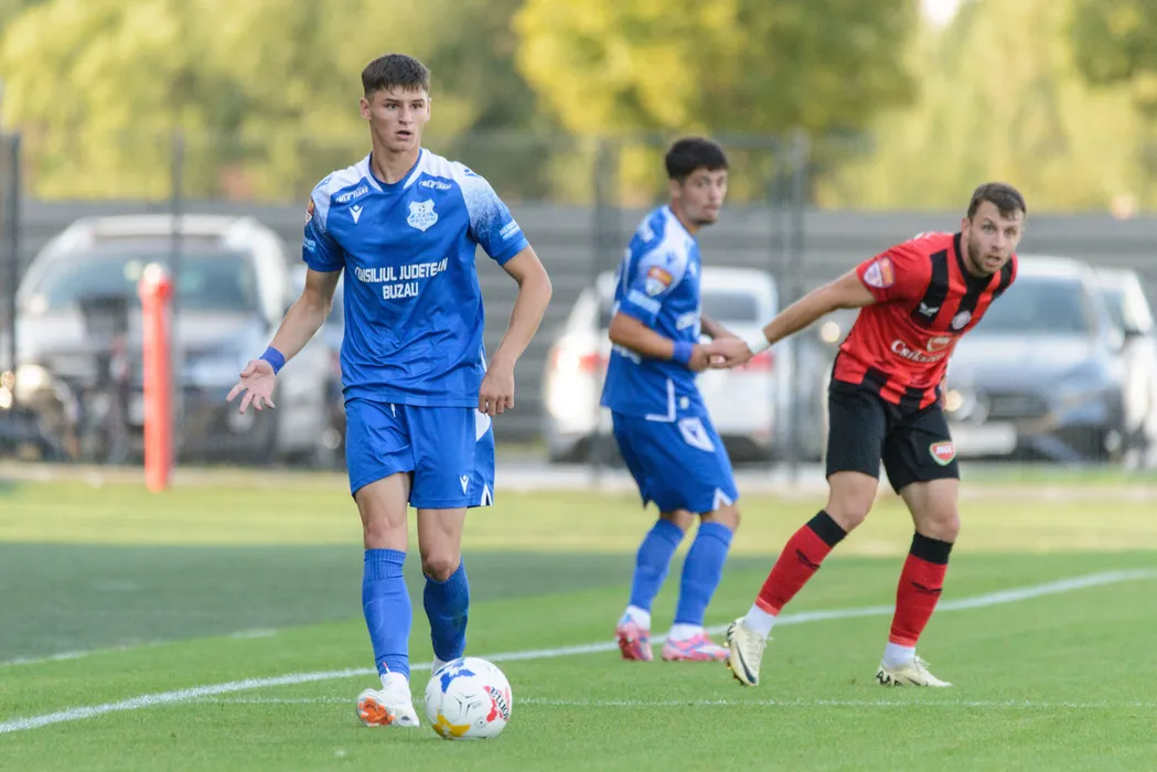 Valentin Robu și Erwin Szilárd Bloj în meciul de fotbal dintre AFK Csikszereda Miercurea Ciuc și AFC Metalul Buzău, contând pentru Liga 2 Casa Pariurilor, desfășurat pe Stadionul Municipal din Miercurea Ciuc, marți 3 septembrie 2024. © FOTO: Pal ZOLTAN/SPORT PICTURES