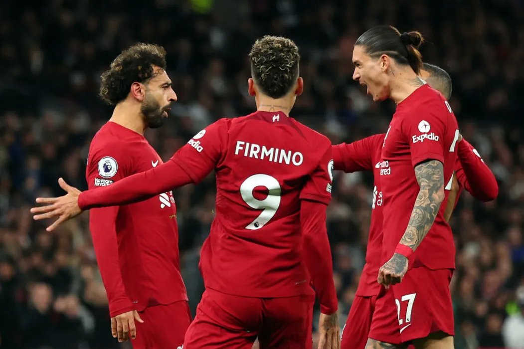 LONDON, ENGLAND - NOVEMBER 06: Mohamed Salah of Liverpool celebrates scoring his 1st goal with Roberto Firmino and Darwin Nunez during the Premier League match between Tottenham Hotspur and Liverpool FC at Tottenham Hotspur Stadium on November 6, 2022 in London, United Kingdom. (Photo by Marc Atkins/Getty Images)