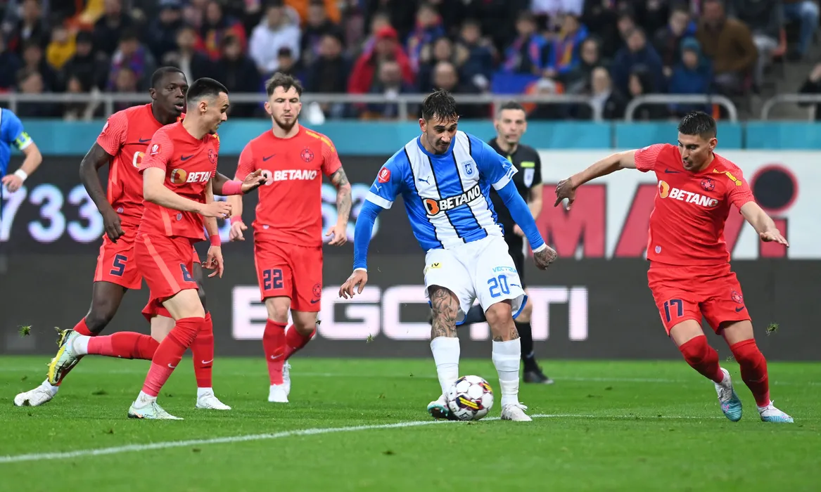 Jovan Markovic marcheaza un gol de langa Adrian Gheorghe Sut, Joyskim Aurelien Dawa Tchakonte, Deian Cristian Sorescu si Iulian Lucian Cristea in meciul de fotbal dintre FCSB si Universitatea Craiova, contand pentru Play-off-ul Superligii Superbet, desfasurat pe Arena Nationala din Bucuresti, sambata 18 martie 2023. © FOTO:Razvan Pasarica/SPORT PICTURES