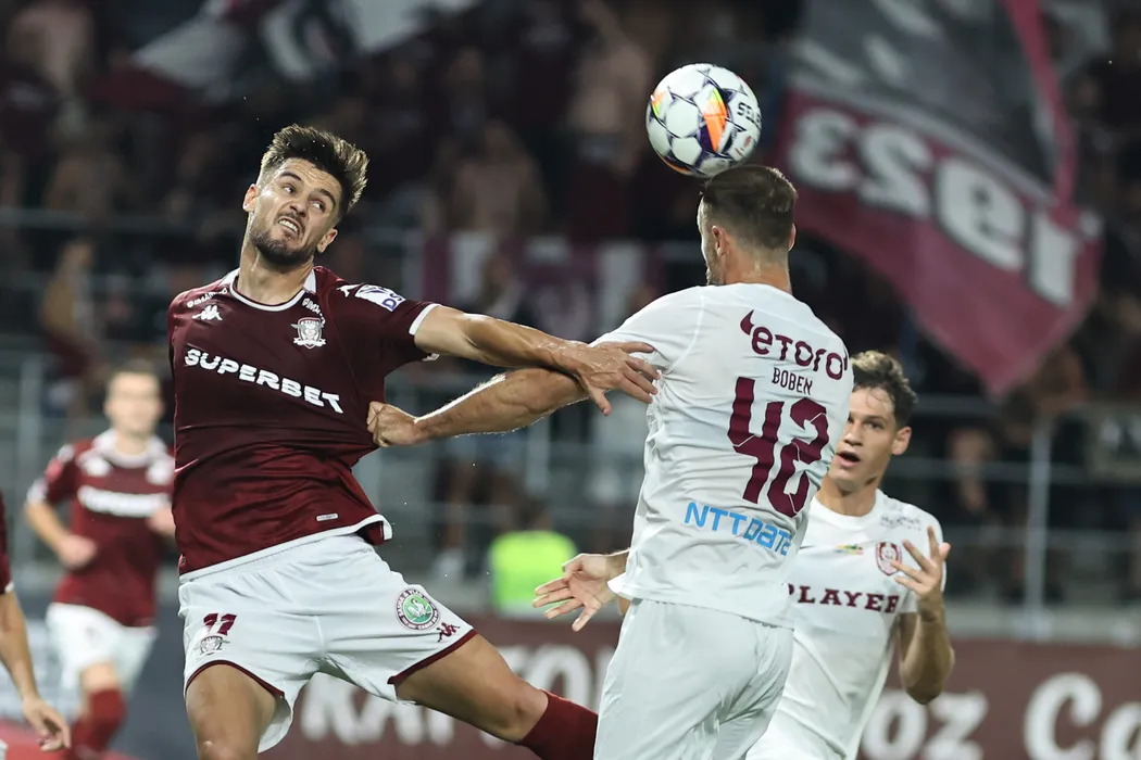 Borisav Burmaz și Matija Boben în meciul de fotbal dintre FC Rapid 1923 București și FC CFR 1907 Cluj, contând pentru Superliga Superbet, desfășurat pe Stadionul Superbet Arena - Giulești din București, sâmbătă 20 iulie 2024. © FOTO: Gică FLUȘTER/SPORT PICTURES
