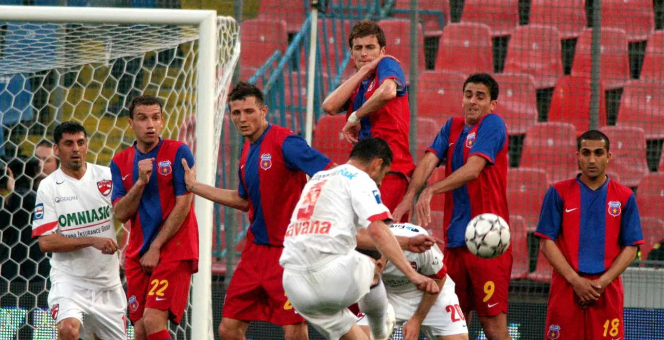 Claudiu Niculescu executa o lovitura libera.in "zid" sunt Ionel Danciulescu,Sorin Paraschiv,Cyril Thereau,Florin Lovin,Valentin Badea si Petre Marin.