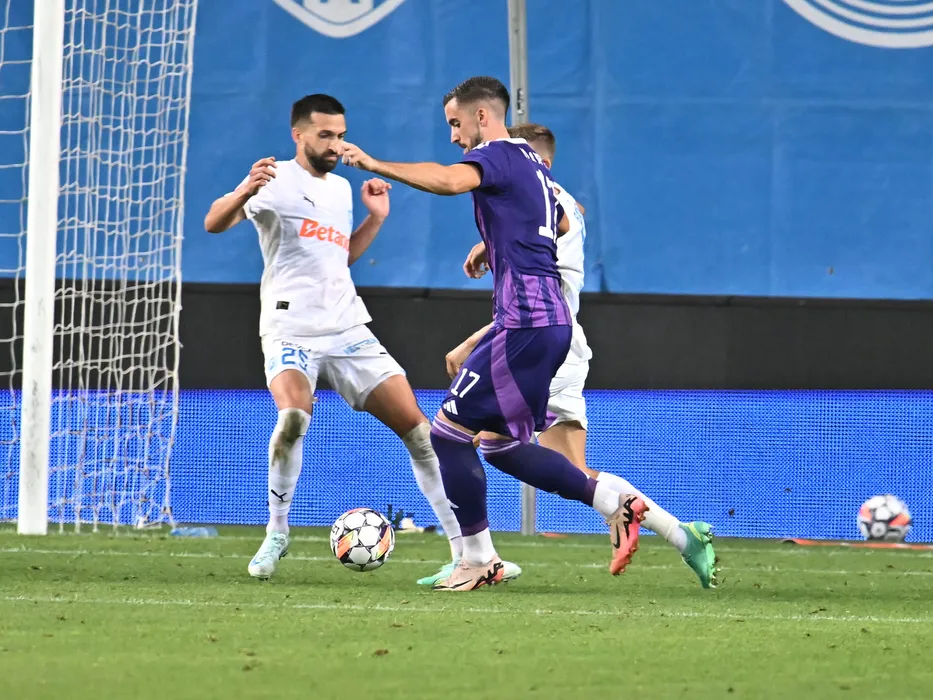 Gregorio Sierra Perez si Arnel Jakupovic in meciul dintre Universitatea Craiova si NK Maribor Branik, contand pentru UEFA Conference League, desfasurat pe Stadionul Ion Oblemenco din Craiova, joi 1 august 2024. © FOTO:Razvan Pasarica/SPORT PICTURES