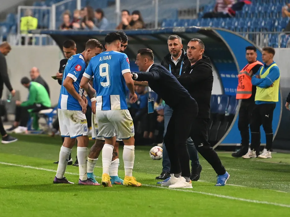 Mirel Radoi si Emil Pieleanu discuta cu fotbalistii craioveni Nicusor Silviu Bancu si Andrei Virgil Ivan la meciul de fotbal dintre Universitatea Craiova si FC Voluntari, contand pentru Superliga Superbet, desfasurat pe Stadionul Ion Oblemenco din Craiova, vineri 30 septembrie 2022. © FOTO:Razvan Pasarica/SPORT PICTURES