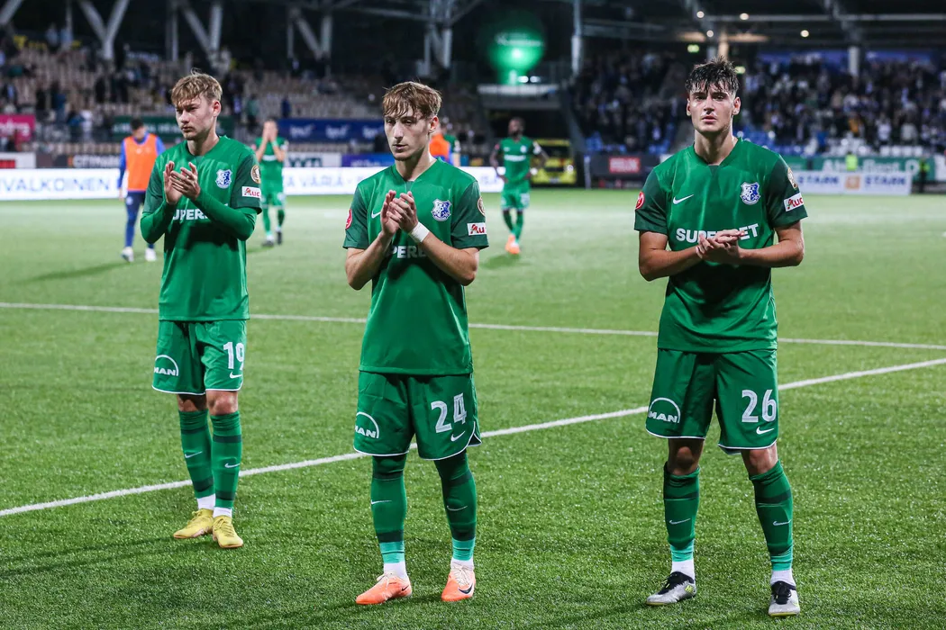 Fotbalistii constanteni Luca Cristian Andronache, Constantin Grameni si Adrian Mazilu saluta galeria dupa meciul de fotbal dintre HJK Helsinki si Farul Constanta, contand pentru UEFA Europa Conference League, desfasurat pe Helsinki Football Stadium din Helsinki, joi 31 august 2023. © FOTO:Antonio Vasile/SPORT PICTURES