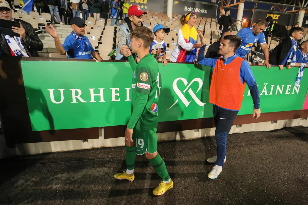 Fotbalistii constanteni Luca Cristian Andronache si Alexandru Buzbuchi saluta galeria dupa meciul de fotbal dintre HJK Helsinki si Farul Constanta, contand pentru UEFA Europa Conference League, desfasurat pe Helsinki Football Stadium din Helsinki, joi 31 august 2023. © FOTO:Antonio Vasile/SPORT PICTURES