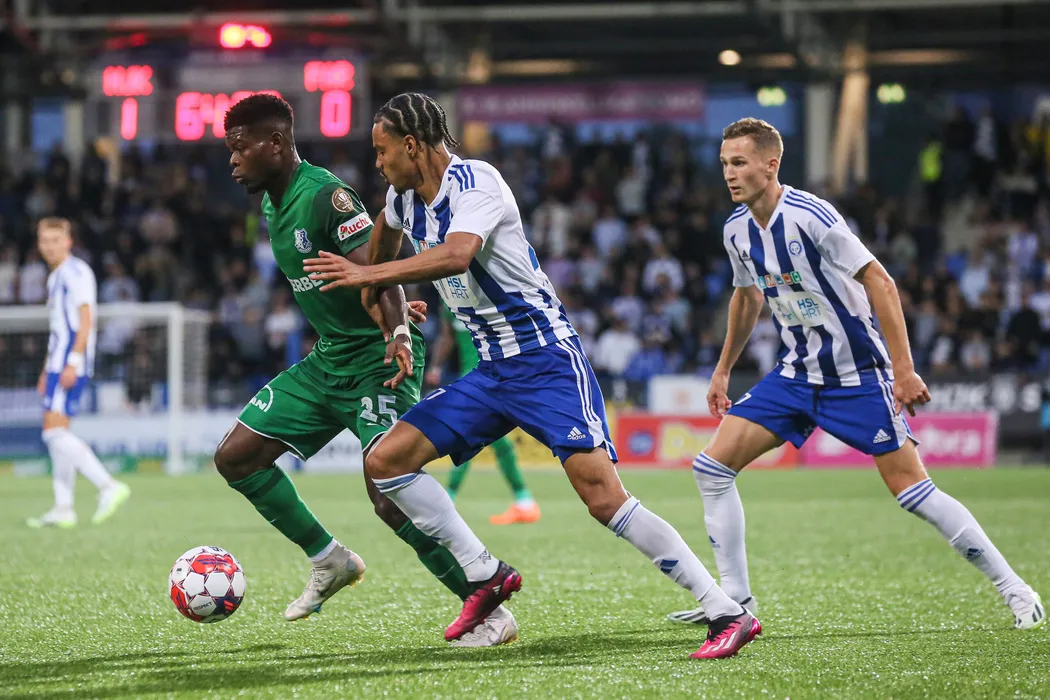 David Enagnon Kiki, Hassane Bandé si Santeri Hostikka in meciul de fotbal dintre HJK Helsinki si Farul Constanta, contand pentru UEFA Europa Conference League, desfasurat pe Helsinki Football Stadium din Helsinki, joi 31 august 2023. © FOTO:Antonio Vasile/SPORT PICTURES