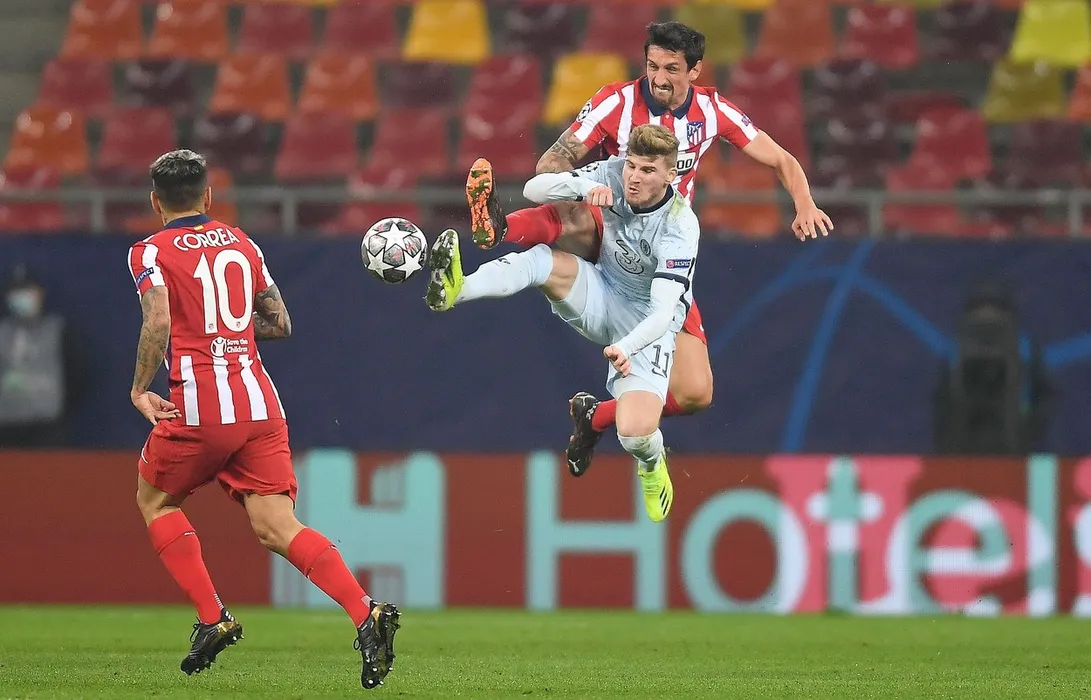 Timo Werner of Chelsea and Stefan Savic of Atletico Madrid in action