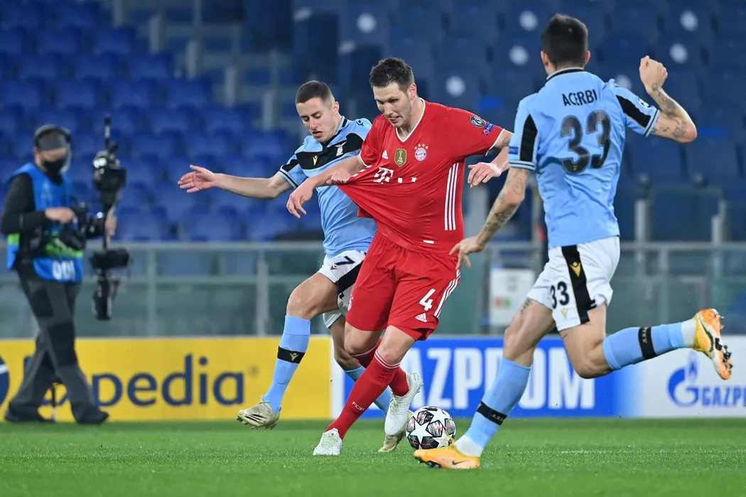 Bayern Munich's German defender Niklas Suele (C) challenges Lazio's Montenegrin midfielder Adam Marusic (L) and Lazio's Italian defender Francesco Acerbi during the UEFA Champions League round of 16 first leg football match Lazio Rome vs Bayern Munich on February 23, 2021 at the Olympic stadium in Rome.,Image: 592992757, License: Rights-managed, Restrictions: , Model Release: no