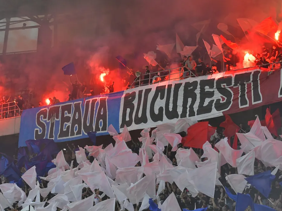 Baner Steaua Bucuresti printre fumigene la meciul de fotbal dintre Steaua Bucuresti si FK Csikszereda Miercurea Ciuc, contand pentru Liga a-2-a Casa Pariurilor, desfasurat pe Stadionul Steaua-Ghencea din Bucuresti, miercuri 4 august 2021. © FOTO:Razvan Pasarica/SPORT PICTURES