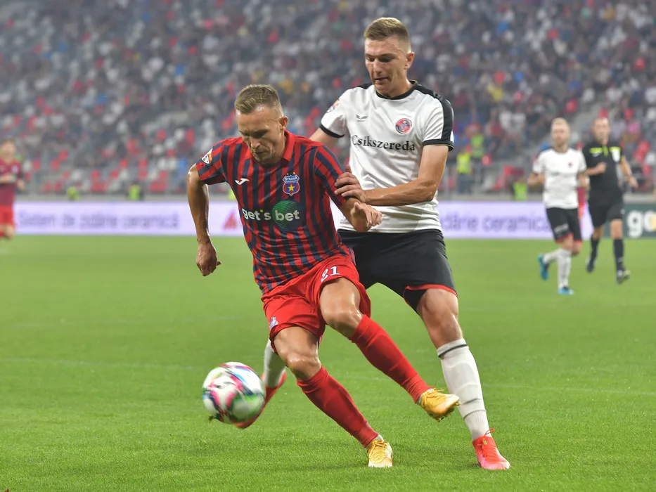 Vasile Buhaescu si Daniel Veregut in meciul de fotbal dintre Steaua Bucuresti si FK Csikszereda Miercurea Ciuc, contand pentru Liga a-2-a Casa Pariurilor, desfasurat pe Stadionul Steaua-Ghencea din Bucuresti, miercuri 4 august 2021. © FOTO:Razvan Pasarica/SPORT PICTURES