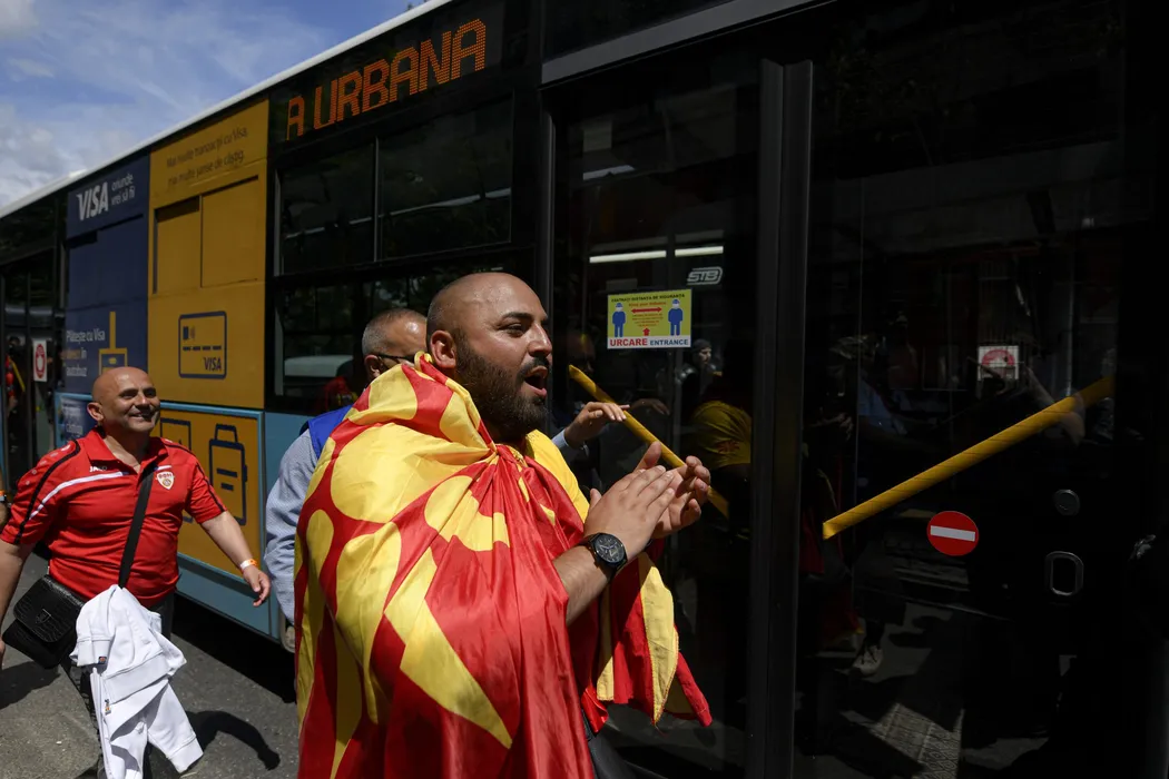 Suporterii reprezentativei de fotbal a Republicii Macedonia de Nord asteapta un autobuz inaintea meciului din grupa C a campionatului european de fotbal EURO 2020 impotriva echipei Ucrainei, in Centrul Vechi din Bucuresti, joi, 17 iunie 2021. ANDREEA ALEXANDRU / MEDIAFAX FOTO