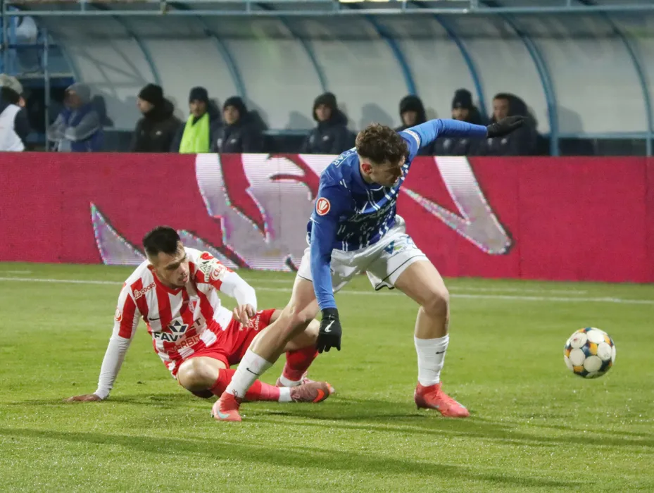 Eduard Gabriel Radaslavescu si Flavius Iacob in meciul de fotbal dintre Farul Constanta si UTA Arad, contand pentru Superliga Superbet, desfasurat pe Stadionul central al Academiei Gheorghe Hagi din Ovidiu, luni 15 decembrie 2025. © FOTO:Sorin Danielciuc/SPORT PICTURES