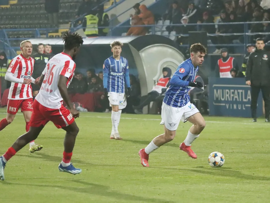 Eduard Gabriel Radaslavescu si Richard Odada in meciul de fotbal dintre Farul Constanta si UTA Arad, contand pentru Superliga Superbet, desfasurat pe Stadionul central al Academiei Gheorghe Hagi din Ovidiu, luni 15 decembrie 2025. © FOTO:Sorin Danielciuc/SPORT PICTURES