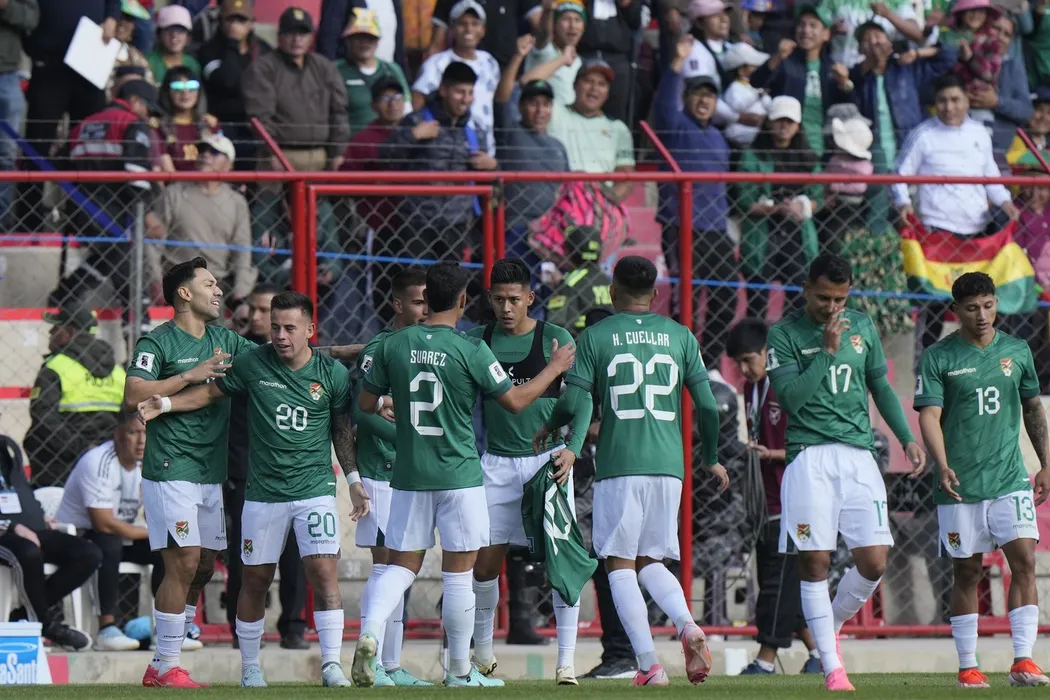 Bolivia's Ramiro Vaca, center, celebrates with his teammates after scoring his side's opening goal against Venezuela during a qualifying soccer match for the FIFA World Cup 2026 at the Municipal de Villa Ingenio stadium in El Alto, Bolivia, Thursday, Sept. 5, 2024.,Image: 905113062, License: Rights-managed, Restrictions: This content is intended for editorial use only. For other uses, additional clearances may be required., Model Release: no