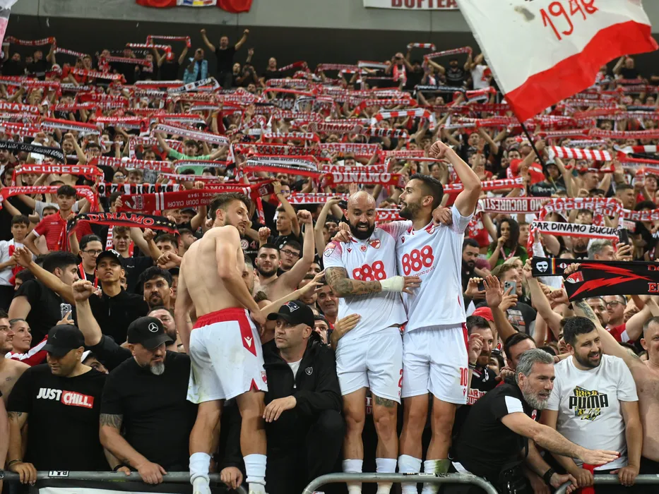 Fotbalistii dinamovisti Nelut Stelian Rosu, Gabriel Rodrigues De Moura si Daniel Gago Iglesias canta alaturi de galerie dupa meciul de fotbal dintre Dinamo Bucuresti si FC Arges, contand pentru mansa tur a barajului de promovare in Superliga Superbet, desfasurat pe Arena Nationala din Bucuresti, luni 29 mai 2023. © FOTO:Razvan Pasarica/SPORT PICTURES