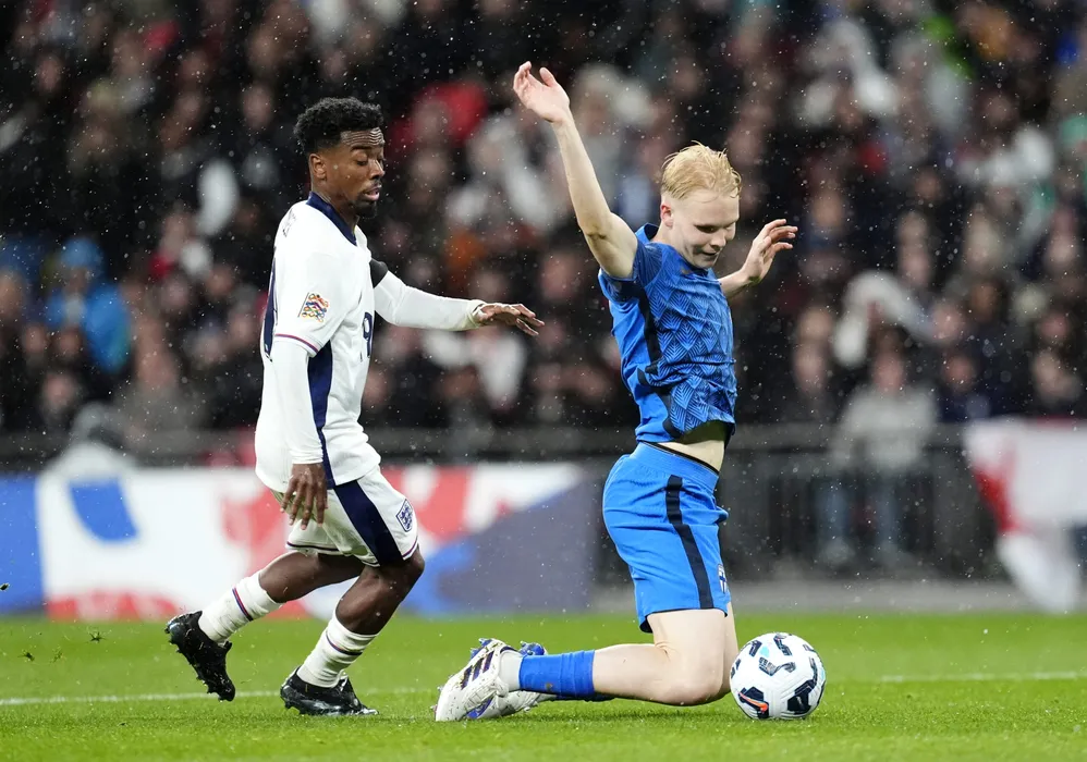10 September 2024, United Kingdom, London: England's Angel Gomes fouls Finland's Matti Peltola during the UEFA Nations League Group B soccer match betwwen England and Finland at Wembley Stadium. Photo: Nick Potts/PA Wire/dpa