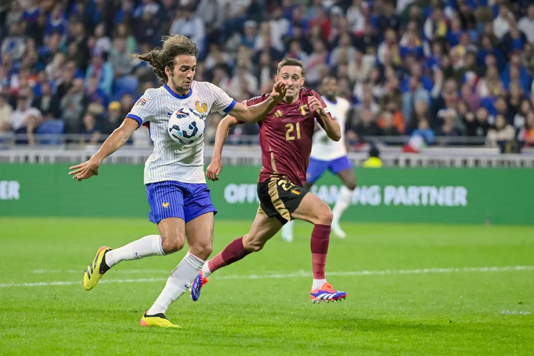 September 9, 2024, Lyon, North Rhine-Westphalia, France: Matteo Guendouzi (France) und Timothy Castagne (Belgium) battle for the ball during the UEFA Nations League 2024/2025 League A - Group 2 match between France and Belgium at Groupama-Stadion on September 9, 2024 in Lyon , France. (Credit Image: © Harry Langer/DeFodi via ZUMA Press)