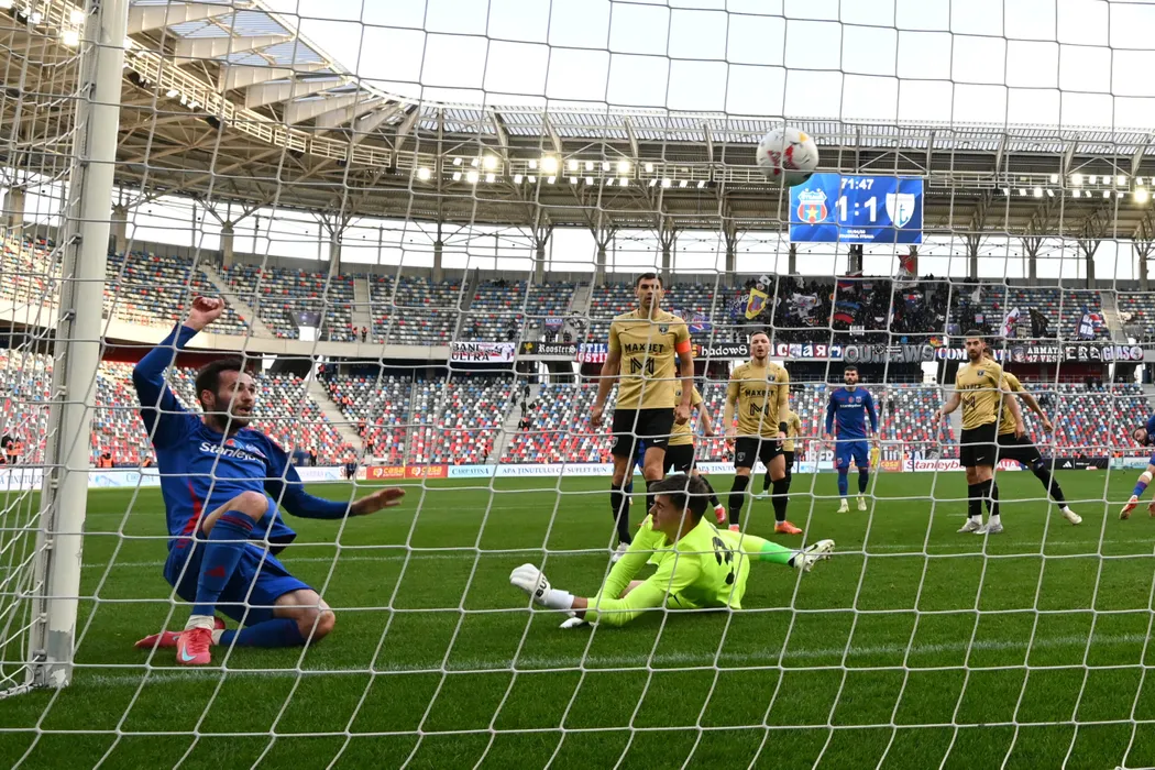 Remus Bogdan Chipirliu marcheaza un gol in poarta lui Iustin Constantin Chirila sub privirile lui Igor Armas, Ionut Pantiru, Doru Popadiuc si Andrei Pitian in meciul de fotbal dintre Steaua Bucuresti si FC Voluntari, contand pentru Play off-ul Ligii a-2-a Casa Pariurilor, desfasurat pe Stadionul Steaua-Ghencea din Bucuresti, miercuri 9 aprilie 2025. © FOTO:Razvan Pasarica/SPORT PICTURES