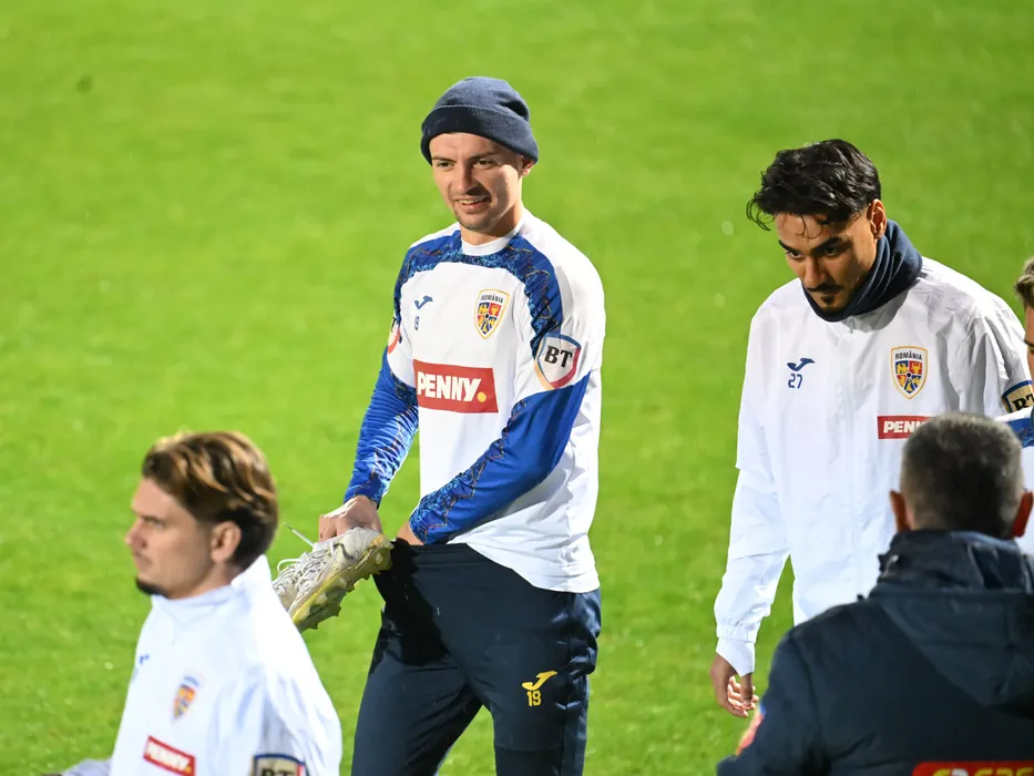 Fotbalistii romani Florin Tanase si Stefan Baiaram la antrenamentul oficial de dinaintea meciului amical impotriva Moldovei, desfasurat la Centrul National de Fotbal de la Mogosoaia, miercuri 8 octombrie 2025. © FOTO:Razvan Pasarica/SPORT PICTURES