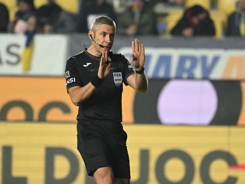 Arbitrul central Radu Petrescu reacționează in meciul de fotbal dintre Petrolul Ploiesti si FC Arges, contand pentru Superliga Superbet, desfasurat pe Stadionul Ilie Oana din Ploiesti, vineri 13 februarie 2026. © FOTO:Razvan Pasarica/SPORT PICTURES