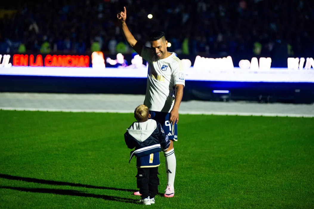 Colombian football player Radamel Falcao Garcia is celebrating with his son during his welcoming event to Millonarios F.C. in El Campin stadium in Bogota, Colombia, on July 16, 2024.