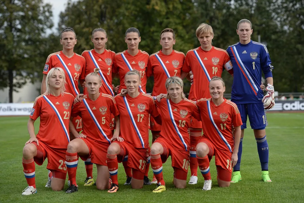 2492628 09/13/2014 Members of the Russian national women's football team Darya Makarenko, Valentina Orlova, Alla Sidorovskaya, Yekaterina Dmitrenko, Kseniya Tsybutovich, Elvira Todua, second row, from left, and Yelena Morozova, Olga Petrova, Yekaterina Pantyukhina, Yelena Terekhova and Yekaterina Sochneva, front row, from left, before the Football World Cup 2015 qualification match between the national women's teams of Russia and Germany.,Image: 205463973, License: Rights-managed, Restrictions: , Model Release: no, Credit line: Profimedia