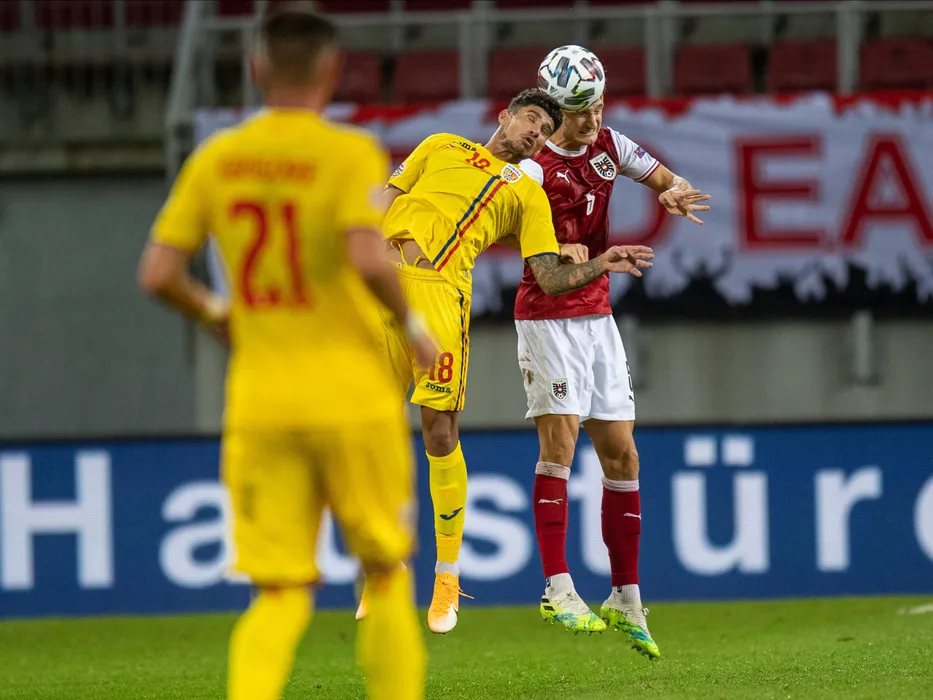 Florinel Coman si Stefan Posch in meciul de fotbal dintre Austria si Romania, contand pentru Liga Natiunilor, desfasurat fara spectatori pe Stadionul Wörthersee din Klagenfurt, luni 7 septembrie 2020. © FOTO:SPORT PICTURES
