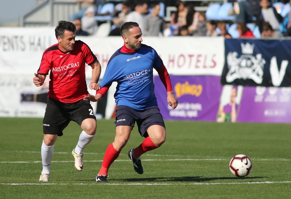 Marian Aliuta (D), in timpul partidei caritabile organizata de Liga Legendelor care marcheaza 40 de ani de la debutul lui Ioan Andone in Liga 1, disputata pe stadionul Anghel Iordanescu din Voluntari, duminica, 24 martie 2019. Donatiile stranse in urnele amplasate in incinta stadionului vor fi directionate catre trei copii cu nevoi speciale din comuna Voluntari, dar si catre Kassandra Rotariu, fetita fotbalistului Iosif Rotariu, care urmeaza sa treaca printr-o noua interventie chirurgicala. GEORGE FILIP / MEDIAFAX FOTO