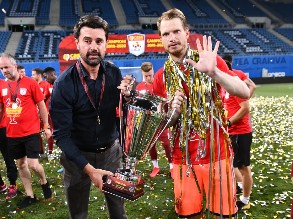 Marian Copilu si Giedrius Arlauskis pozeaza alaturi de trofeu dupa castigarea titlului de campioana in urma meciului de fotbal dintre Universitatea Craiova si CFR Cluj, contand pentru play-off-ul Ligii 1 Casa Pariurilor, disputat fara spectatori pe Stadionul Ion Oblemenco din Craiova, luni 3 august 2020. © FOTO:Razvan Pasarica/SPORT PICTURES