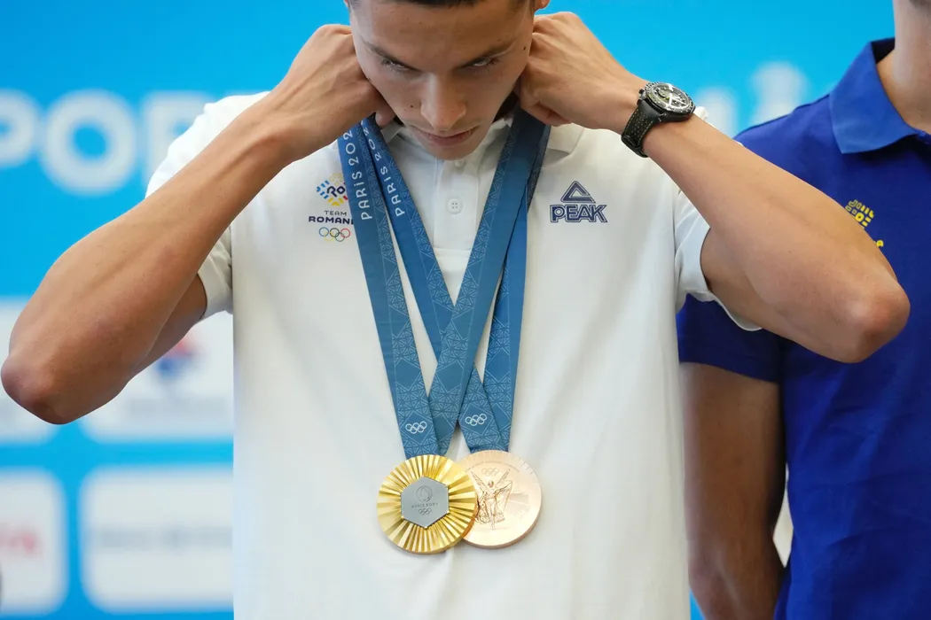 Inotatorul David Popovici, campion olimpic in proba de 200 de metri liber si medaliat cu bronz la 100 de metri liber la Jocurile Olimpice, isi prezinta medaliile la sosirea sa de la Paris, pe aeroportul Henri Coanda din Bucuresti, vineri, 2 august 20024. ANDREEA ALEXANDRU / MEDIAFAX FOTO