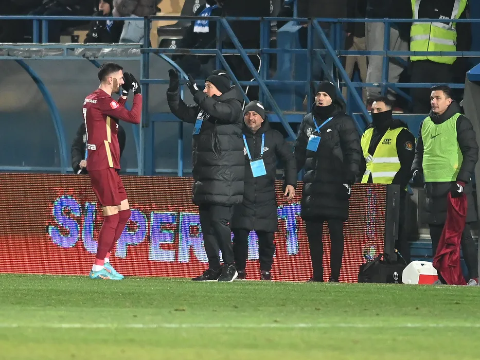 Dan Petrescu il felicita pe Ermal Krasniqi dupa un gol marcat sub privirile lui Costin Curelea si Ovidiu Stefan Hoban in meciul de fotbal dintre Farul Constanta si CFR Cluj, contand pentru Superliga Superbet, desfasurat pe Stadionul central al Academiei Gheorghe Hagi din Ovidiu, luni 23 ianuarie 2023. © FOTO:Razvan Pasarica/SPORT PICTURES