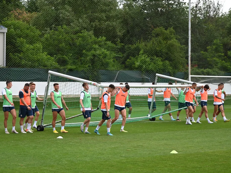 Fotbalistii nationalei transporta o poarta la antrenamentul Romaniei U21, pregatind debutul la Campionatul European U21, desfasurat la Centrul National de Fotbal de la Mogosoaia, joi 15 iunie 2023.© FOTO:Razvan Pasarica/SPORT PICTURES