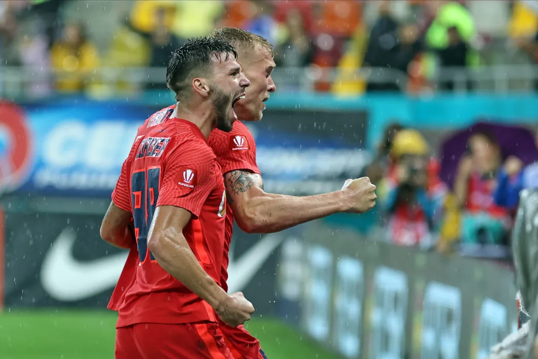 Andrei Cordea (S) si Joonas Tamm (D), de la FCSB, reactioneaza dupa ce au inscris un gol in timpul meciului de fotbal contra echipei AFC Chindia Targoviste din etapa a V-a a Superligii, disputat pe Arena Nationala din Bucuresti, duminica, 14 august 2022. GEORGE FILIP / MEDIAFAX FOTO