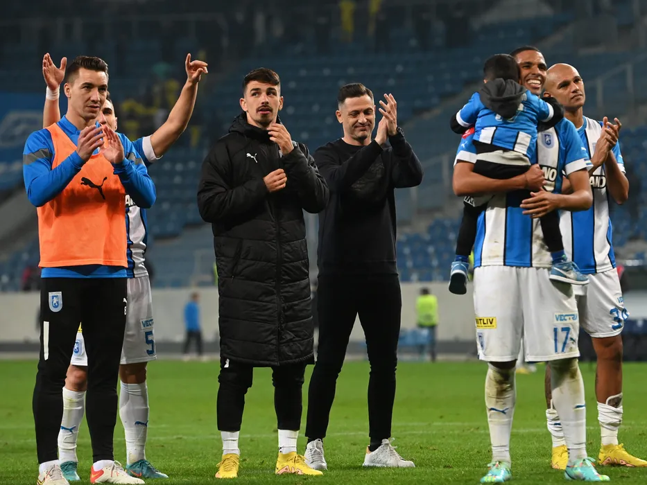 Fotbalistii craioveni Alexandru Mateiu, Sergiu Catalin Hanca, Vitor Ferreira Mosac Rivaldo si Raul Michel Melo Da Silva alaturi de antrenorul lor Mirel Radoi saluta galeria dupa meciul de fotbal dintre Universitatea Craiova si Petrolul Ploiesti, contand pentru Superliga Superbet, desfasurat pe Stadionul Ion Oblemenco din Craiova, sambata 15 octombrie 2022. © FOTO:Razvan Pasarica/SPORT PICTURES