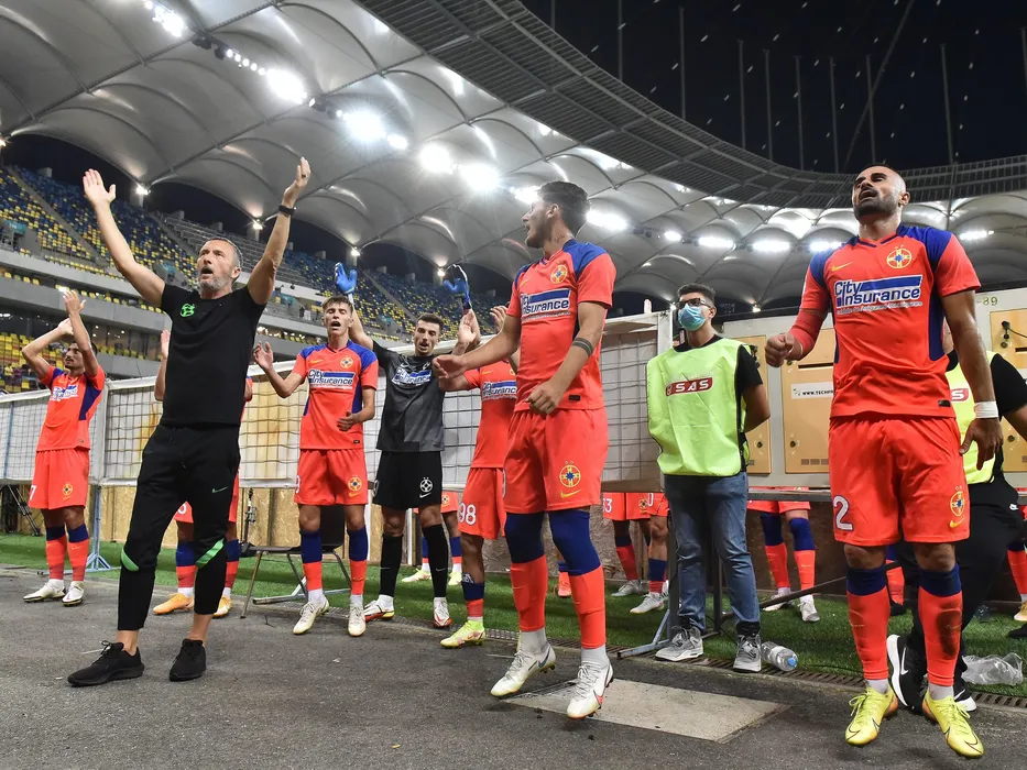 Fotbalistii stelisti Iulian Lucian Cristea, Octavian George Popescu, Andrei Daniel Vlad, Ianis Ilie Stoica si Valentin Cretu alaturi de Mihai Stoica aplauda galeria stelista dupa meciul de fotbal dintre FCSB si Sepsi OSK Sfantu Gheorghe, contand pentru Liga 1 Casa Pariurilor, desfasurat pe Arena Nationala din Bucuresti, luni 23 august 2021. © FOTO:Razvan Pasarica/SPORT PICTURES