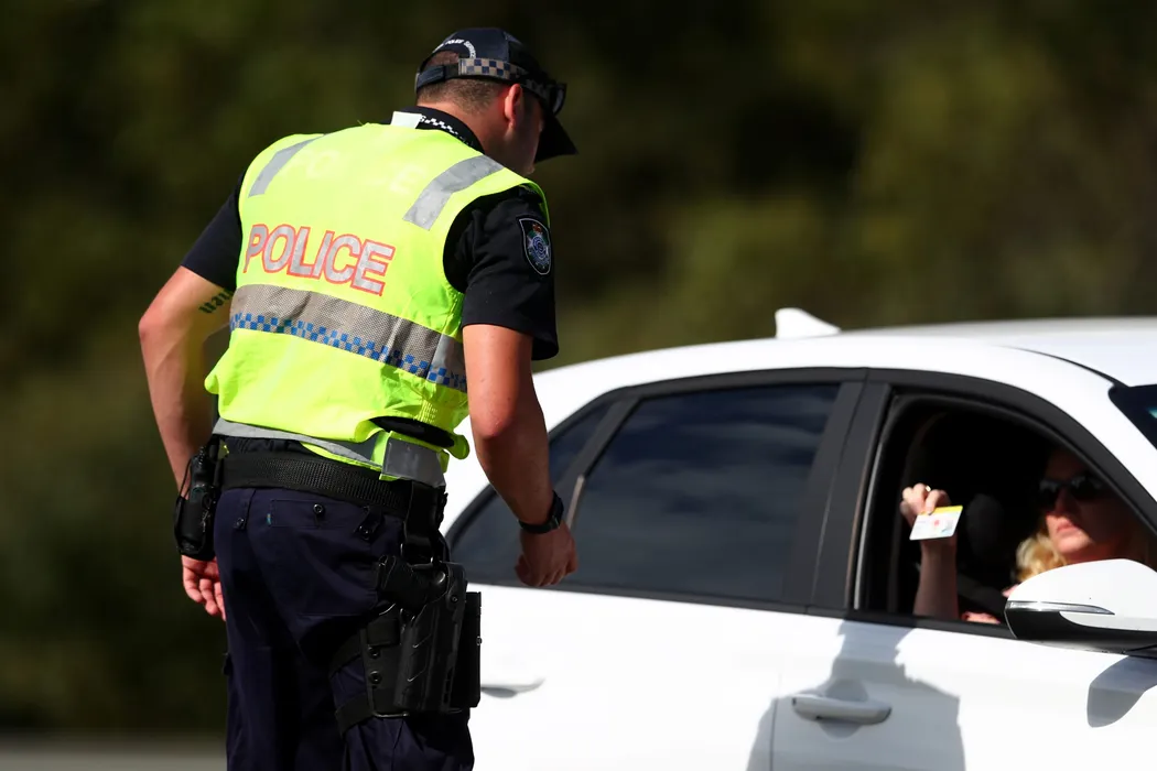 GOLD COAST, AUSTRALIA - MARCH 26: Queensland Police stop vehicles at a Police checkpoint set up at the Queensland and New South Wales border in Coolangatta on March 26, 2020 on the Gold Coast, Australia. Queensland borders have been shut down since midnight in response to the COVID-19 pandemic. Interstate visitors will be turned back, while any Queensland residents returning from other states or territories must now self-isolate for 14 days unless they are an exempt person travelling for freight or other essential travel. There are now 2676 confirmed cases of COVID-19 in Australia and the death toll stands at 11. (Photo by Chris Hyde/Getty Images)
