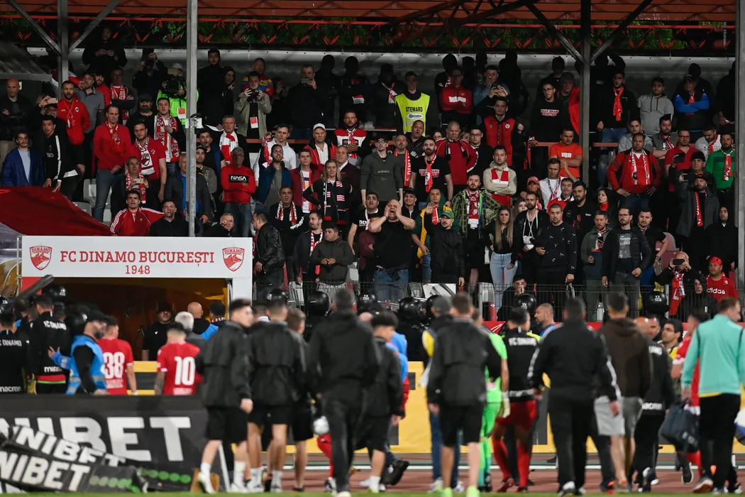 Suporterii formatiei Dinamo reactioneaza la finalul meciului Dinamo - Universitatea Cluj din mansa retur a barajului de mentinere/promovare in Liga 1, disputat pe stadionul Dinamo din Bucuresti, duminica, 29 mai 2022. Dinamo a retrogradat pentru prima data in istoria de 74 de ani a clubului, dupa 1-1 in Stefan cel Mare cu "sepcile rosii", care au promovat in Liga 1. EDUARD VINATORU / MEDIAFAX FOTO