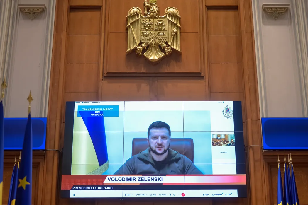 Senatori si deputati participa la sedinta in plenul Parlamentului in care presedintele Ucrainei, Volodimir Zelenski, sustine un discurs prin sistem videoconferinta, la Palatul Parlamentului, luni, 4 aprilie 2022. ALEXANDRU DOBRE / MEDIAFAX FOTO